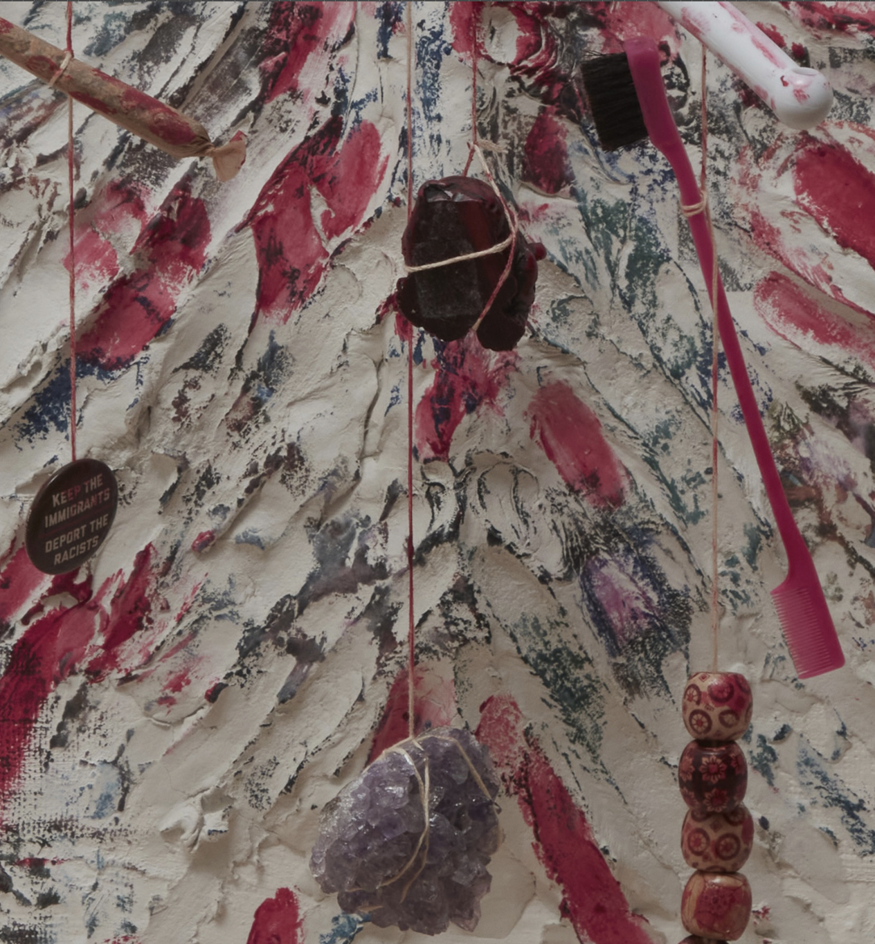 Plaster, plaster bandage, found objects, acrylic paint, and image transfer on wood